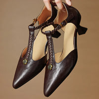 The Talvanna Leather Sandals combine pointed elegance with stable comfort in a classic T-strap design. With a sculpted kitten heel and braided leather strap, these shoes offer timeless charm with modern wearability, perfect for refined evenings or everyday style.